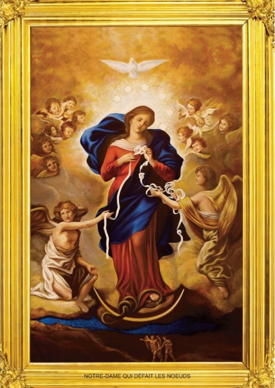 Cette dévotion s’inspire d’un tableau du XVIIᵉ siècle conservé dans l’église Saint-Pierre-am-Perlach à Augsbourg, en Allemagne, où Marie est représentée en train de défaire les nœuds d’un ruban, signe de son aide maternelle pour libérer les croyants de leurs problèmes. Elle s’est largement répandue dans le monde, notamment grâce à sa diffusion encouragée par le pape François.